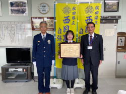 - 2年2組の佐藤由莱さんが10月13日に由利本荘市矢島町地内にて発生した火災を早期に発見し、迅速な通報を行い被害を最小限に防ぎ地域の安全に寄与したということで